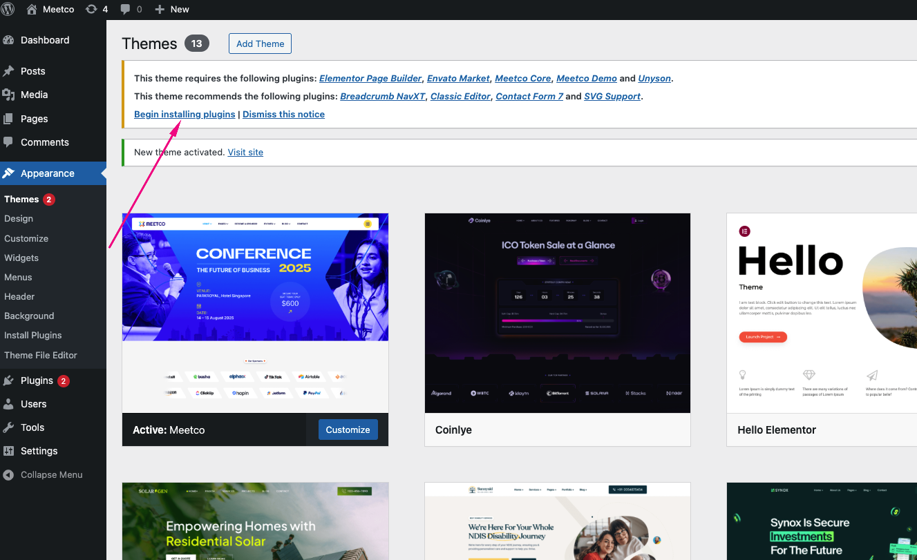 Meetco theme requires a set of core and additional plugins to function correctly. A plugin is an additional component that offers functionality and features beyond a typical WordPress installation. Without them, most of its functionality is not available. After installing the theme you will be prompted to install the required plugins at the top of your dashboard.