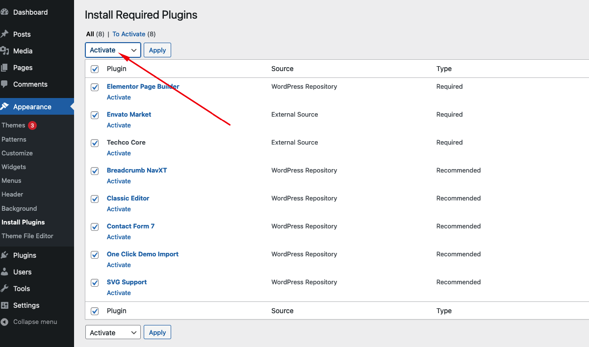 Click on the begin installing plugins link to install all the required plugins.Select all and installSelect all and Activate